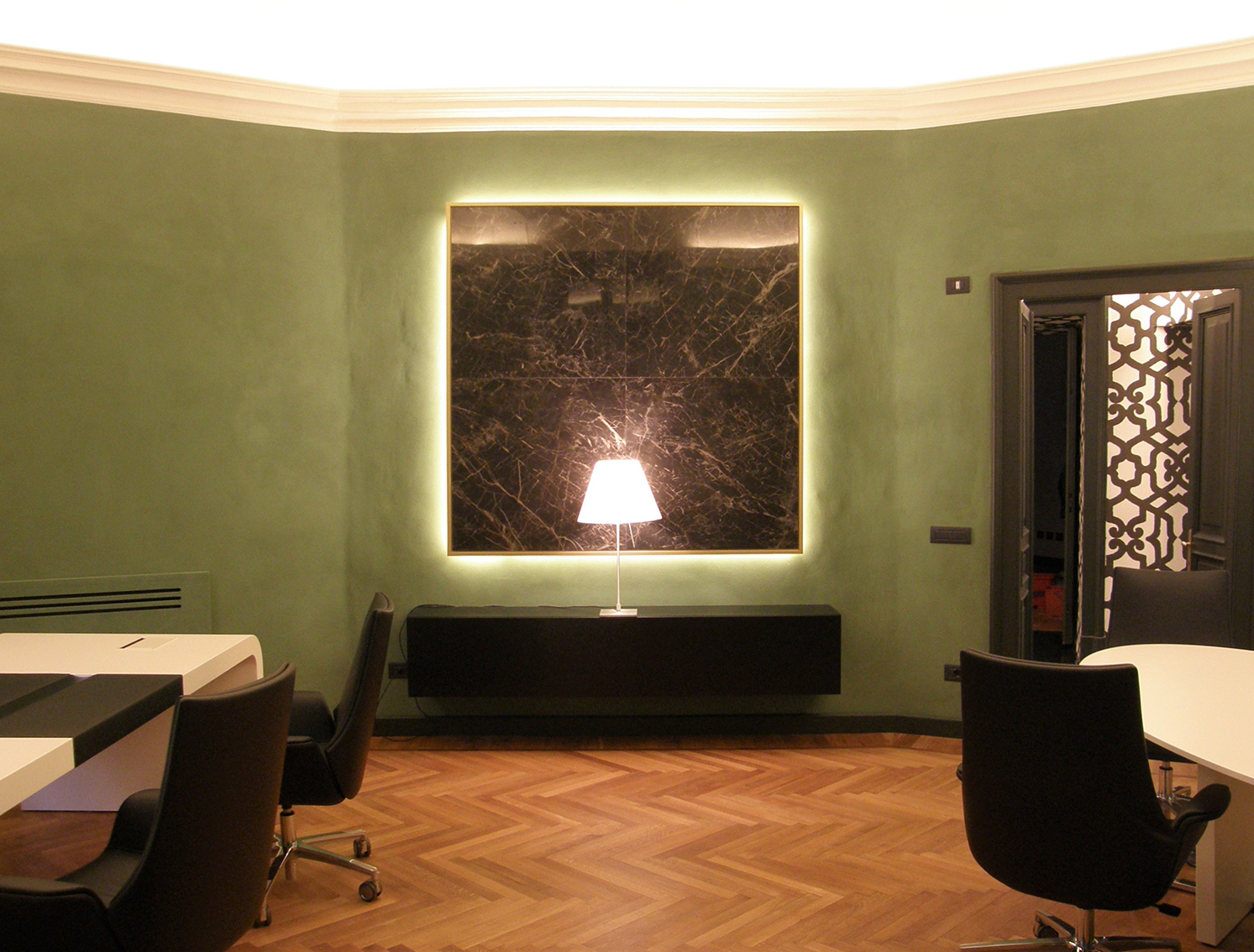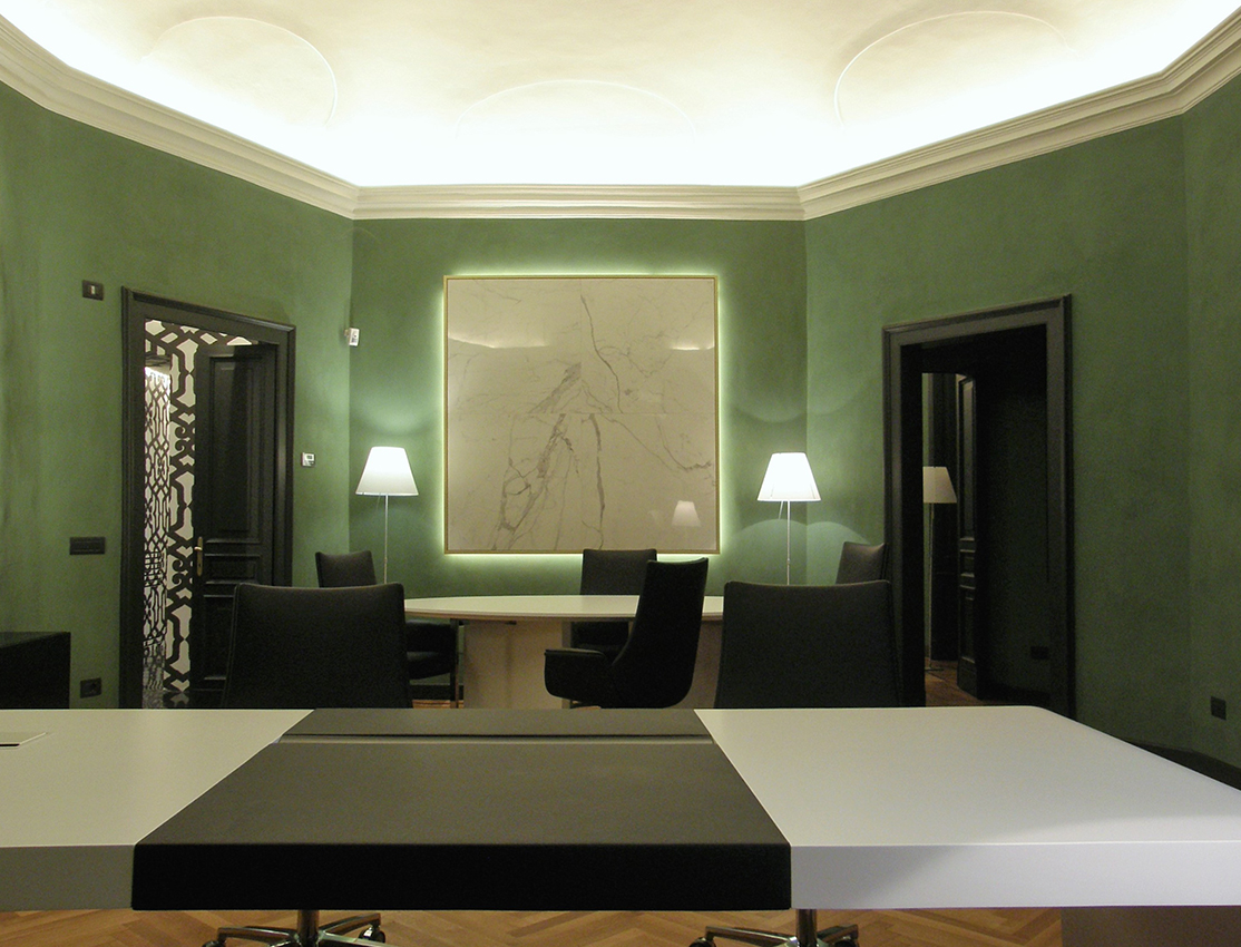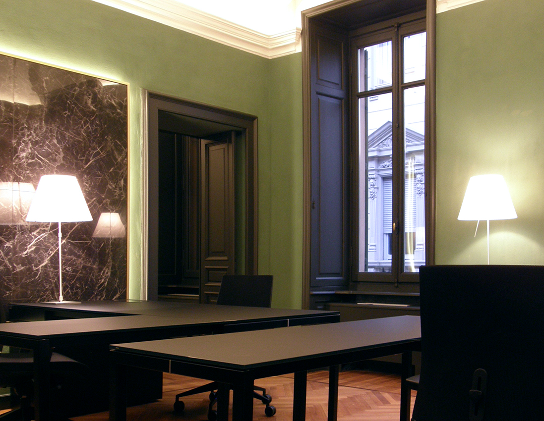 duplicazione, le chiavi di trasformazione degli ambienti. La simmetria in questo progetto è utilizzata per enfatizzare il senso dello spazio, per dargli struttura e conferirgli una ragione logica; si è lavorato sui volumi e soprattutto sull’esaltazione dei punti prospettici. I principi ordinatori sono l’interpretazione ortogonale degli spazi, la simmetria e il ricorso alla prospettiva come fattore di armonia.