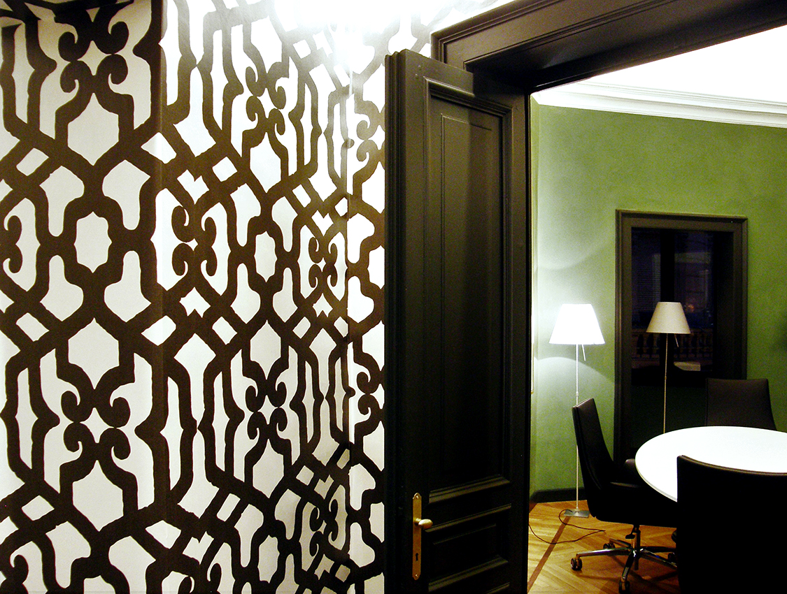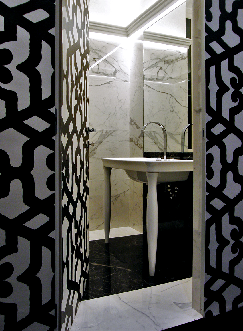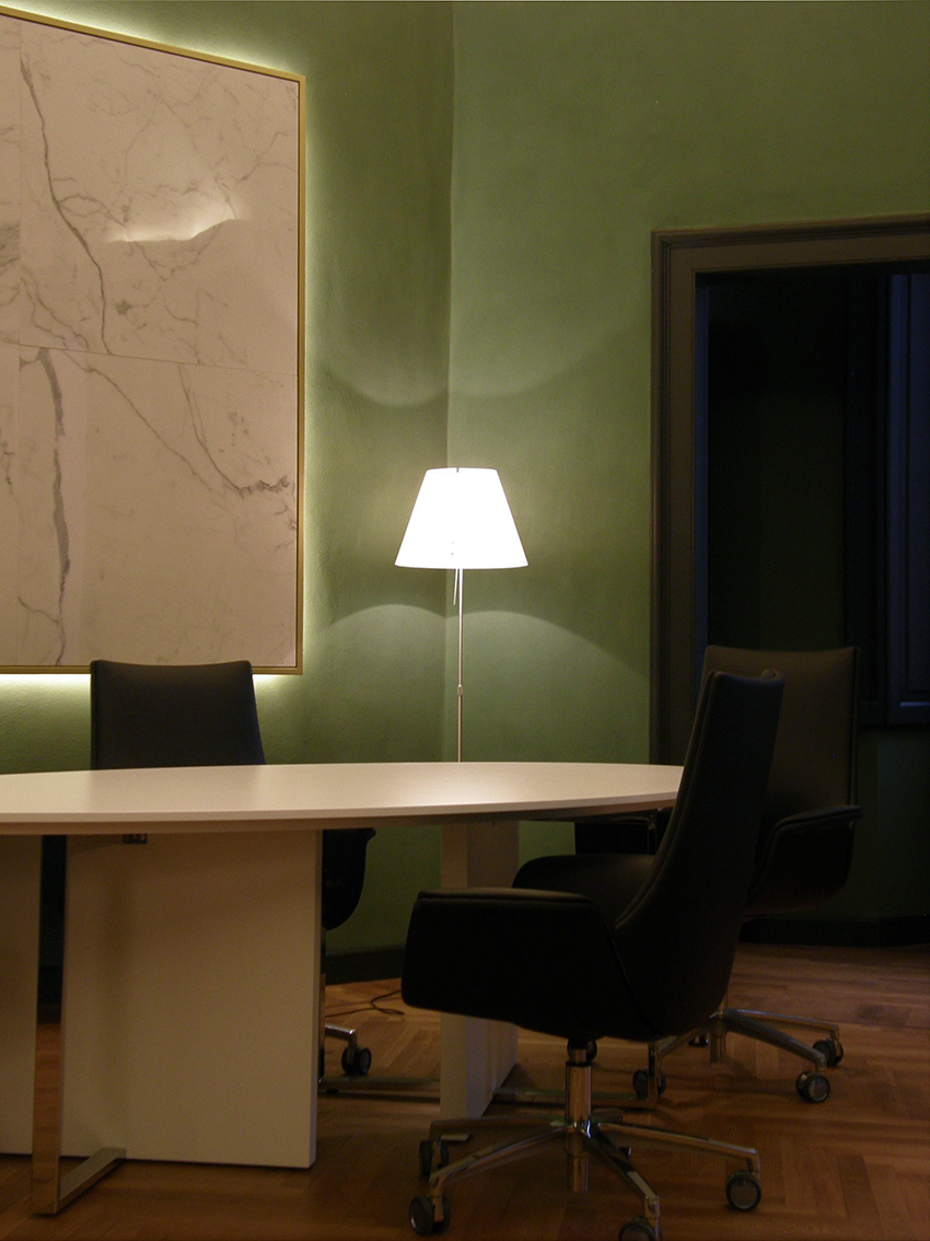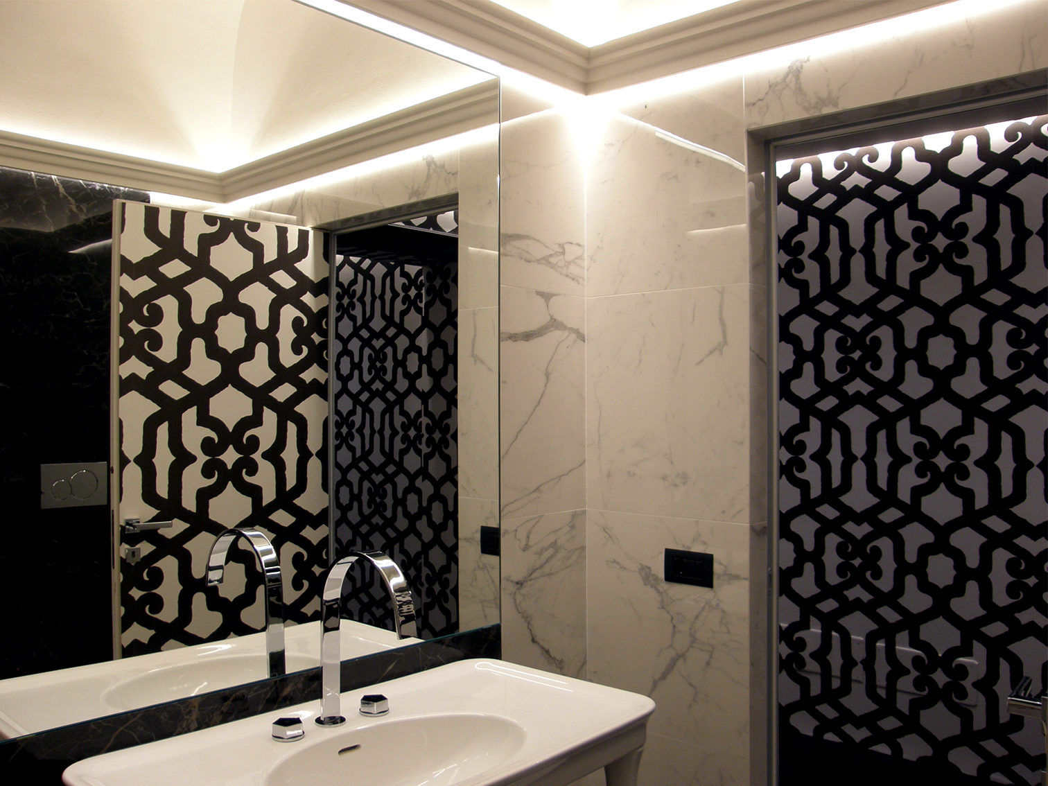 duplicazione, le chiavi di trasformazione degli ambienti. La simmetria in questo progetto è utilizzata per enfatizzare il senso dello spazio, per dargli struttura e conferirgli una ragione logica; si è lavorato sui volumi e soprattutto sull’esaltazione dei punti prospettici. I principi ordinatori sono l’interpretazione ortogonale degli spazi, la simmetria e il ricorso alla prospettiva come fattore di armonia.