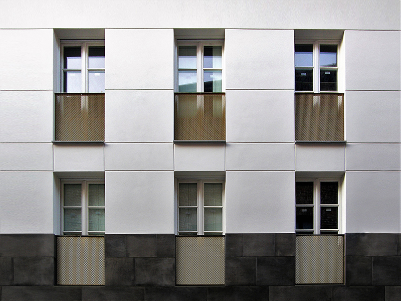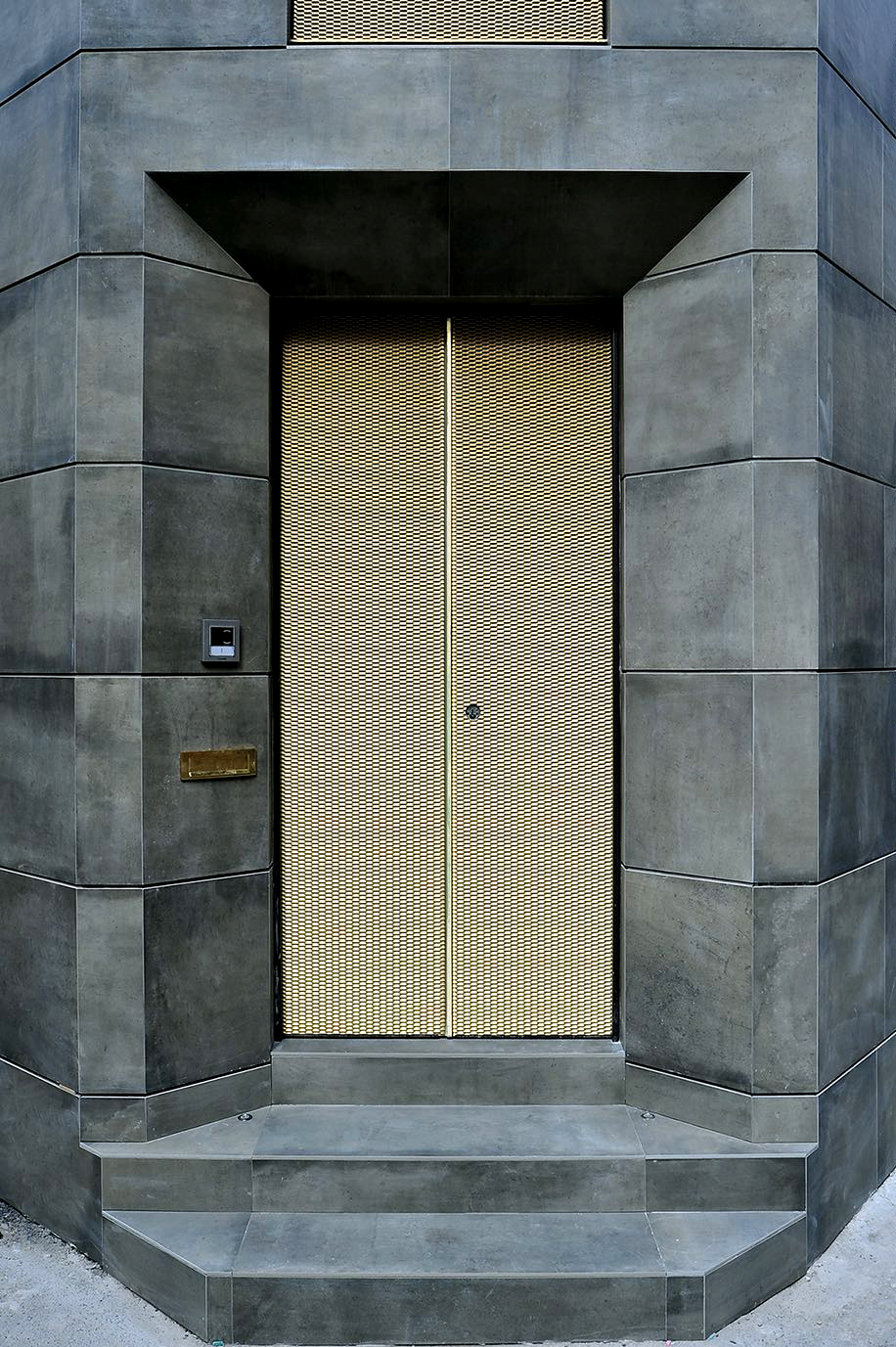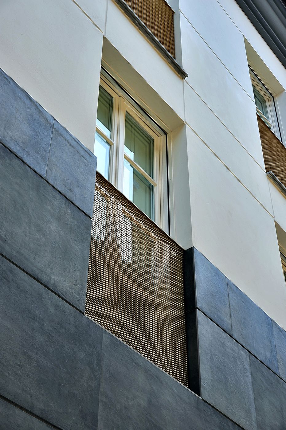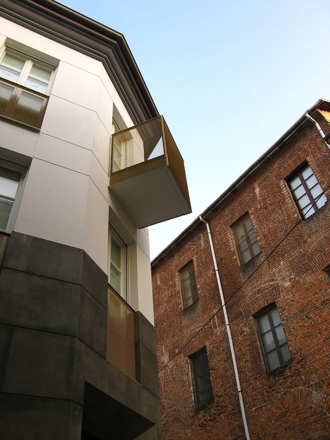 Si è determinato il disegno delle facciate su un ritmo cadenzato regolare e sulla ricerca della simmetria. Le finestre sono state riunite in blocchi da tre, distanziati equamente da assi di simmetria determinati (ingressi). L’opera, minimale e simbolica, cerca di inserirsi armoniosamente nel contesto storico esistente attraverso un gioco tipologico di rilettura dei modelli architettonici consolidati, per raggiungere una modernità più ricercata. Le facciate verso il cortile interno, sono caratterizzate da una serie regolare di portefinestre su lunghi balconi. I prospetti interni, intonacati, presentano fasce marcapiano e basamento in bande orizzontali bugnate e sono completamente tinteggiati di bianco. La soluzione stilistica adottata ha cercato di accentuare, per contrappunto, il senso ed il carattere del luogo, attraverso materiali, forme e tecniche che aggiornino e proiettino verso il futuro i segni e i valori del passato. Gli espliciti riferimenti stilistici del progetto qui presentato sono due famosissime opere: l’immobile “Goldman& Salatsch” a Vienna di Adolf Loos (1909) e l’edificio denominato “Bonjour tristesse” a Berlino di Alvaro Siza (1980), già citazione e omaggio allo stesso Loos.